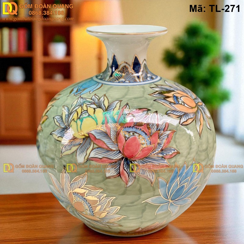 Bình TL-271 được thiết kế tinh xảo với họa tiết Sen mạ vàng 24K cao cấp, biểu tượng cho sự thanh khiết và may mắn trong phong thủy. Sản phẩm vừa mang giá trị thẩm mỹ, vừa giúp gia chủ thu hút tài lộc bền vững.