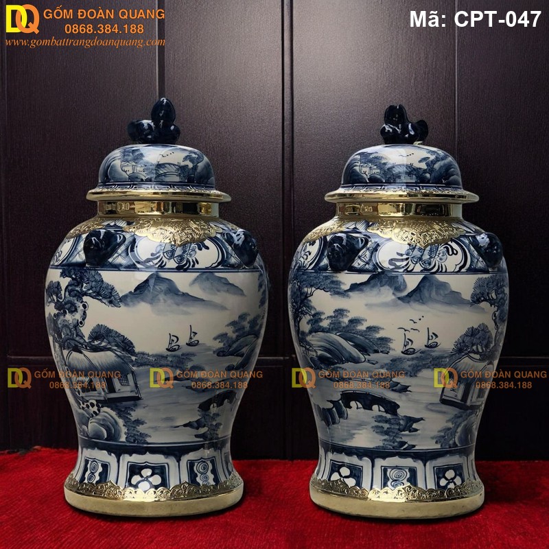 Chóe Bát Tràng men lam cảnh Sơn thủy bọc đồng CPT-047 nổi bật với lớp men lam truyền thống kết hợp cùng chi tiết bọc đồng sang trọng. Sản phẩm có nhiều dung tích từ 10 lít đến 120 lít, giúp gia chủ dễ dàng chọn lựa theo không gian sử dụng.