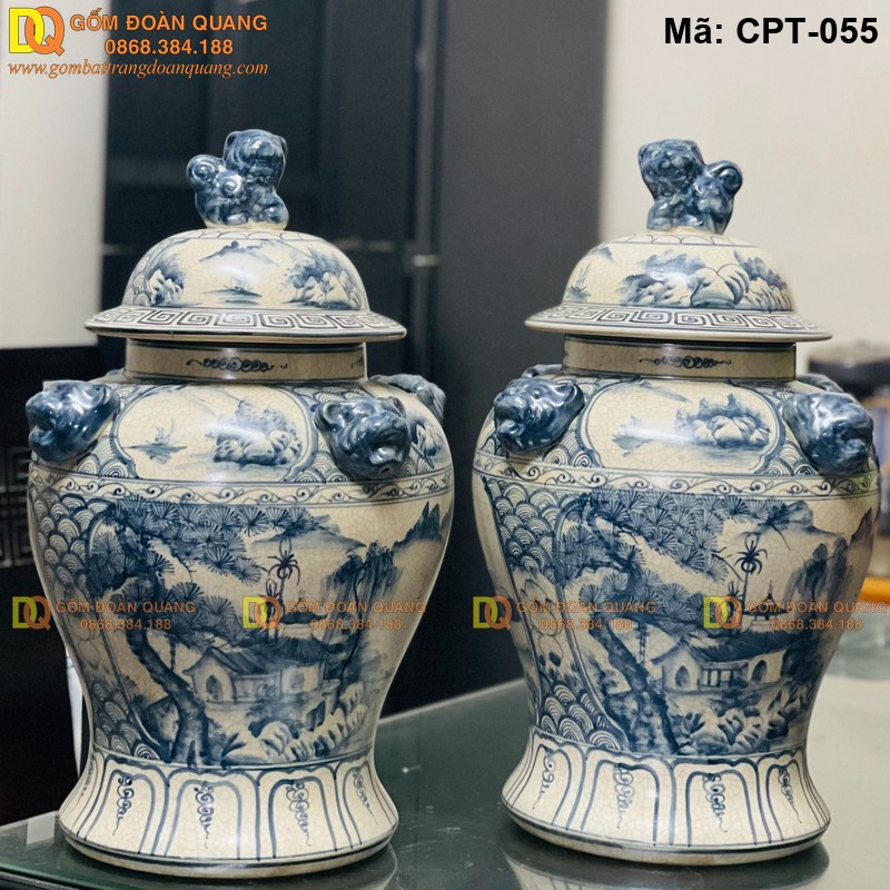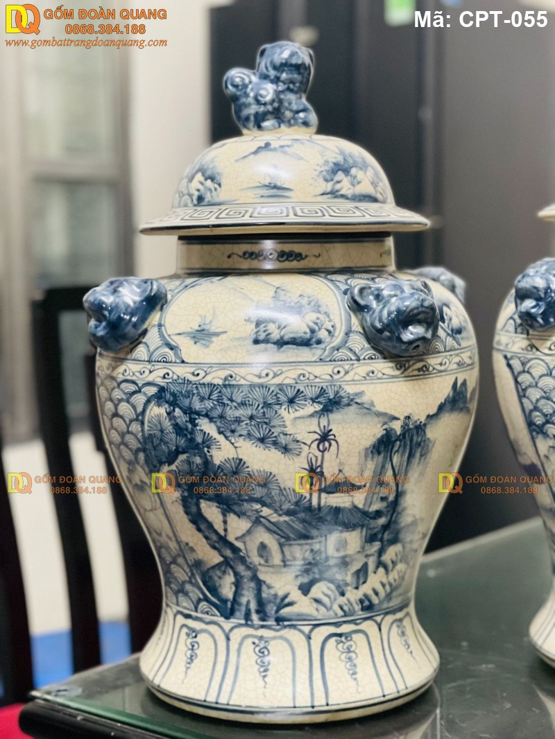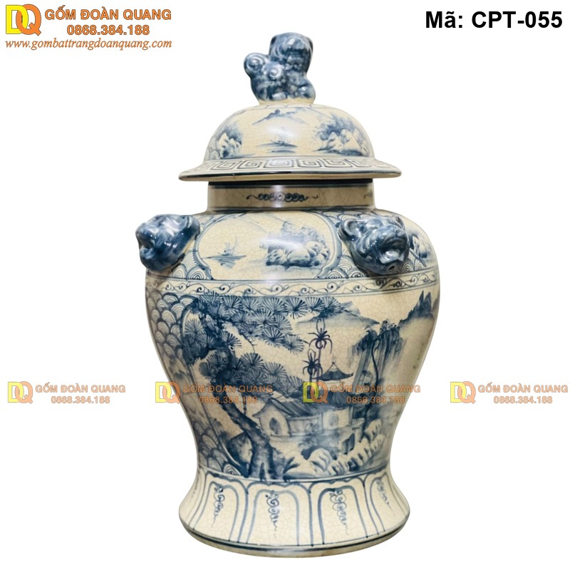 Chóe gốm sứ men rạn cảnh Sơn thủy Tùng Chùa CPT-055 gây ấn tượng nhờ sự kết hợp của cảnh Sơn thủy hùng vĩ và hình ảnh Tùng cổ thụ vững chắc bên mái chùa cổ kính. Với dung tích 40 lít, sản phẩm vừa có giá trị phong thủy, vừa mang nét nghệ thuật truyền thống đặc sắc.