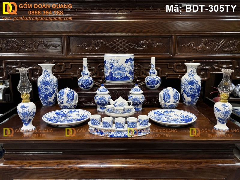 BDT-305TY là bộ đồ thờ men lam cao cấp, nổi bật với bát hương họa tiết hoa sen – biểu tượng của sự thanh cao, giác ngộ và lòng hiếu thảo trong văn hóa Phật giáo và dân gian.