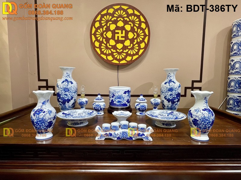 Mã BDT-386TY mang phong cách đồ thờ truyền thống đặc trưng của Bát Tràng với hoa văn cổ điển, đường nét thanh thoát. Sản phẩm được làm từ đất sét tinh khiết, nhào trộn theo công thức lâu đời, trải qua quá trình tạo hình thủ công và nung hai lần ở nhiệt độ cao. Kết quả là bộ sản phẩm có màu men lam cổ, dịu mắt và mang vẻ đẹp sâu sắc, phù hợp với nhiều không gian tâm linh.