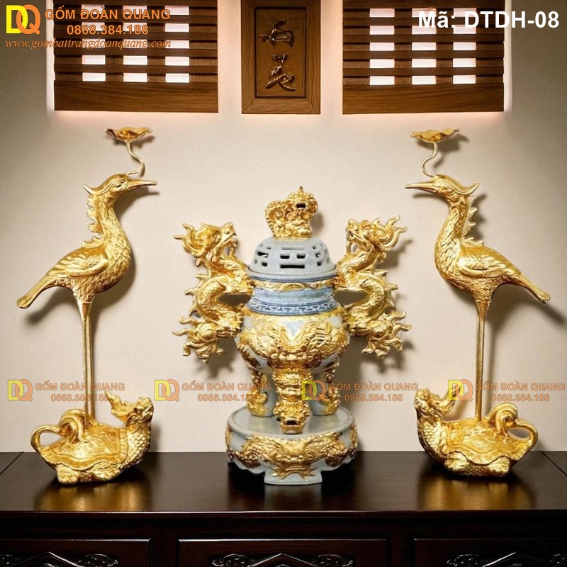 Bộ tam sự là một phần không thể thiếu trong hệ thống đồ thờ truyền thống của người Việt, bao gồm ba vật phẩm chính: đỉnh thờ (lư hương), đôi hạc chầu và đôi chân nến. Mỗi chi tiết đều mang ý nghĩa tâm linh sâu sắc: đỉnh thờ tượng trưng cho sự kết nối giữa cõi trần và cõi thiêng, hạc biểu trưng cho sự trường thọ, cao quý, còn đôi nến tượng trưng cho ánh sáng dẫn đường tâm linh. Việc sở hữu một đồ thờ gốm sứ Bát Tràng chất lượng như bộ tam sự dát vàng mã DTDH-08 không chỉ làm tăng sự uy nghiêm cho bàn thờ mà còn thể hiện lòng hiếu kính của con cháu.